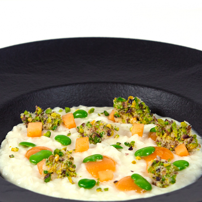 RISOTTO AL GRANA PADANO DOP, DOLCE FORTE FORTE DI MELONE E CROCCANTE DI GRANA PADANO DOP AI PISTACCHI